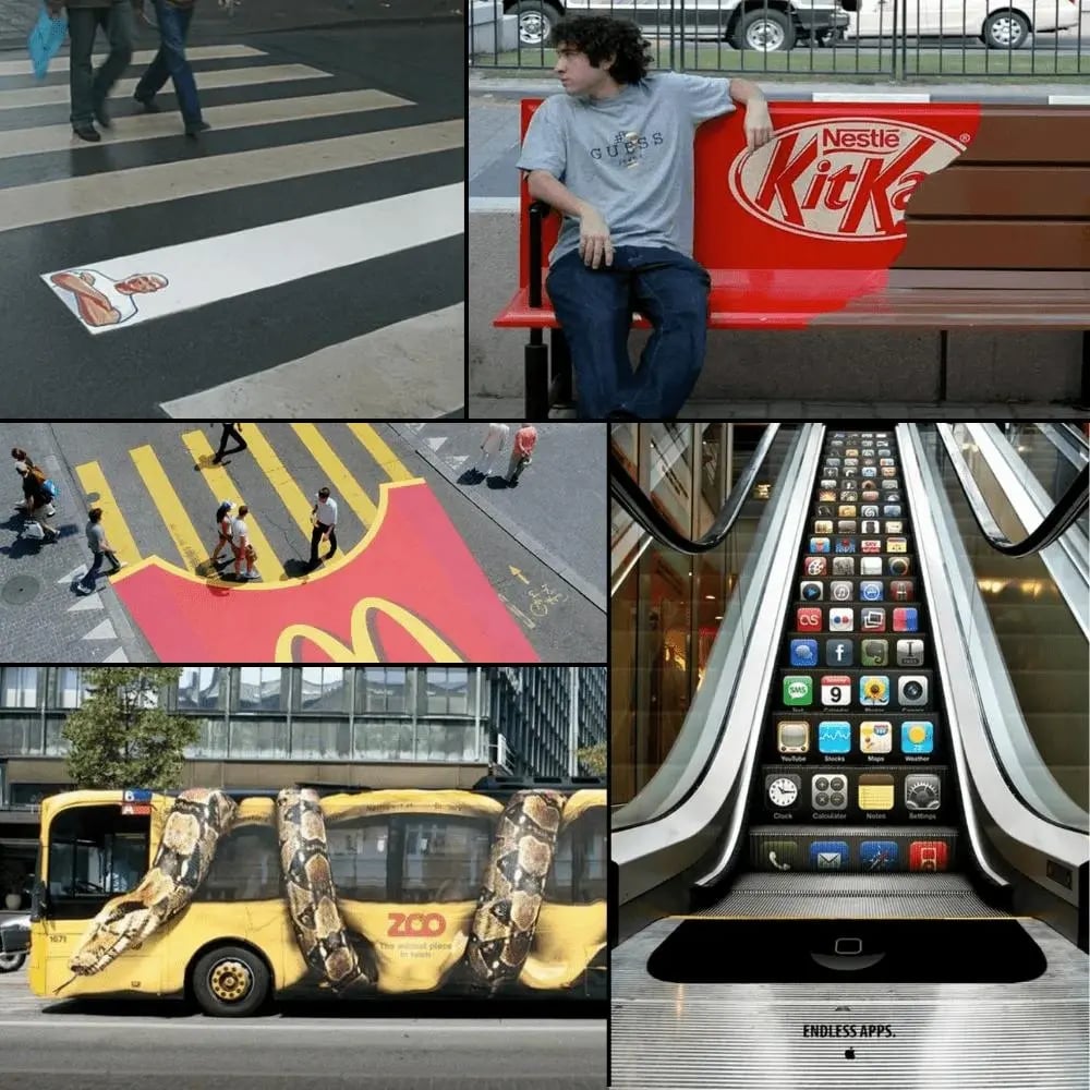 Using public spaces creatively (e.g., bus stops, benches, staircases). - 🟡 Experiential Marketing: